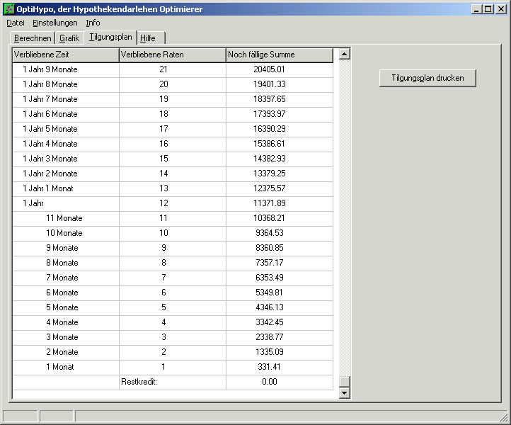 Über den Karteikartenreiter "Tilgungsplan" gelangt man zum tabellarischen Ablauf der Tilgung.